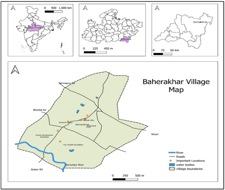 Figure 2 provides a detailed location map of the village, showcasing its precise geographical position and surroundings. This map offers a detailed visual representation of the village’s placement within its broader context, highlighting nearby landmarks, geographical features, and neighbouring areas. It serves as a valuable tool for understanding and navigating the village’s specific location and its relationship with the surrounding regions.