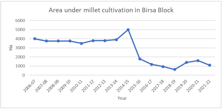 The area under millet cultivation in Birsa Bock is declined from 4000 acres in 2006-07 to 1100 acres in 2021-22. Which is also showing the decline in millet cultivation.