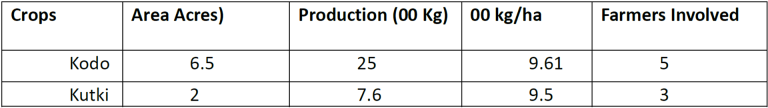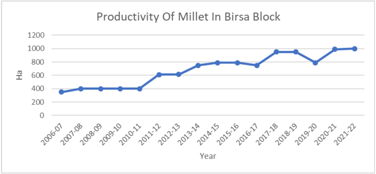 The above graph represents the productivity of millet in Birsa Block. The maximum production for Kodo is about 10 Qlt/Ha.