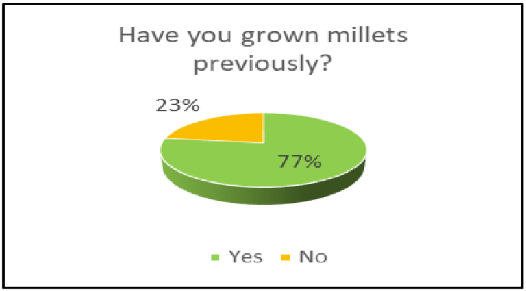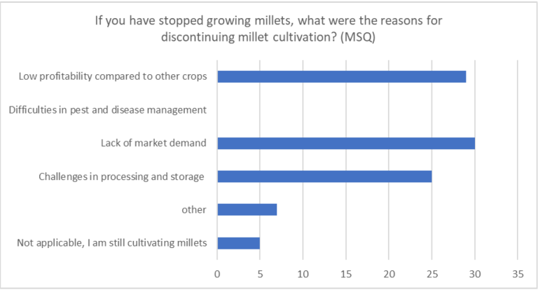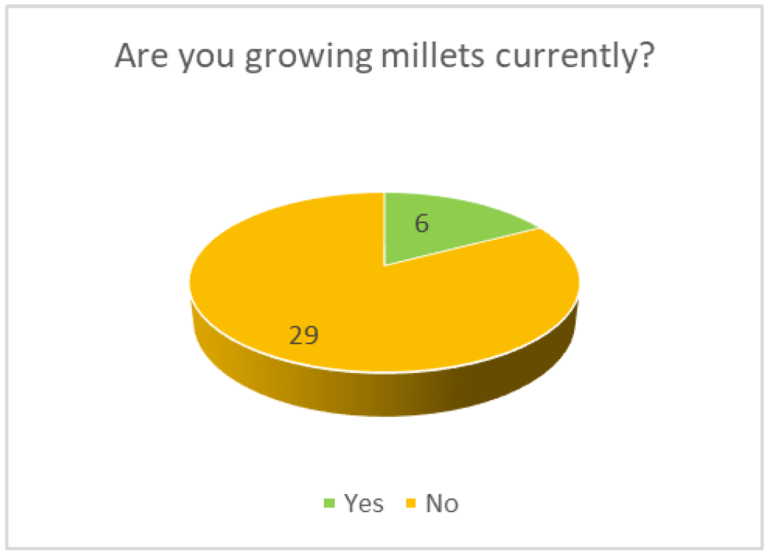 The data on millet cultivation in Baherakhar village reveals a worrying decline. Out of the 35 surveyed households, only 6 (approximately 17.14 %) are currently growing millets, while the majority of 29 households have stopped. This significant drop of about 77.78% from the past indicates a shift away from this traditional agricultural practice.