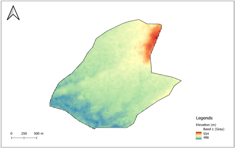The contour map of Baherakhar village (Figure 3) displays a range of elevation levels, with the highest point marked at 554 meters above sea level and the lowest point marked at 486 meters above sea level. The contour lines on the map connect points of equal elevation, providing a clear visual representation of the terrain’s undulating nature. The highest point at 554 meters offers stunning panoramic views of the surrounding landscape, while the lowest point at 486 meters encompasses water bodies, contributing to the village’s diverse topography.