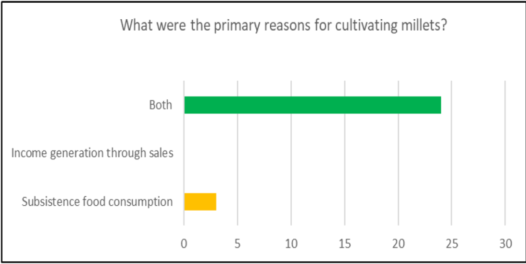In the past Baherakhar village, millets had a crucial impact on both the local economy and people’s eating habits. Out of the 35 households surveyed, 3 households grew millets mainly for their own food consumption, while 24 households grew millets for both making money and feeding their families. This shows that millets played a significant role in the village’s economy and were also an important part of people’s diets.
