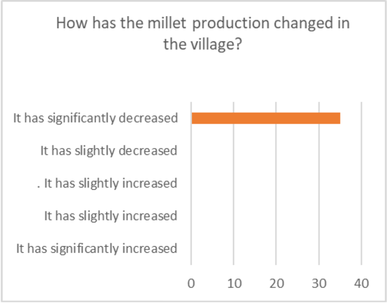 The millet production in Baherakhar village has experienced a significant decrease in the past few years. All 35 respondents reported that millet production has “significantly decreased.” This data suggests a concerning trend of declining millet cultivation and production in the village.