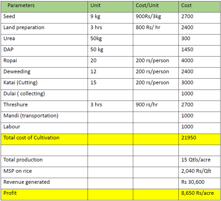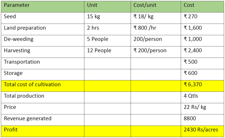 The above calculation indicates that the profit for cultivating Kodo millet is 2,430 Rs per acre, while the profit for cultivating rice is 8,650 Rs per acre. This significant difference in profitability is one of the reasons behind the shift from millet cultivation to cash crops like rice in Baherakhar village. The higher profit potential of rice cultivation is incentivizing farmers to focus more on cash crops to improve their income and livelihood opportunities.