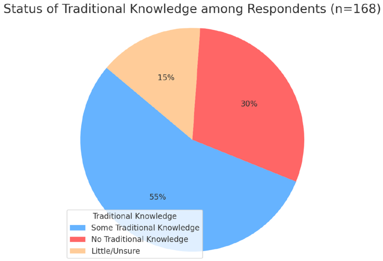 One of the striking findings of the survey is the erosion of traditional ecological knowledge in the community. When asked about their knowledge of forest products (such as identifying medicinal plants or knowing their uses), only about 55% of respondents reported having “some traditional knowledge,” whereas 30% admitted to having no traditional knowledge and ~15% said they had only a little or were unsure (Figure 4).
