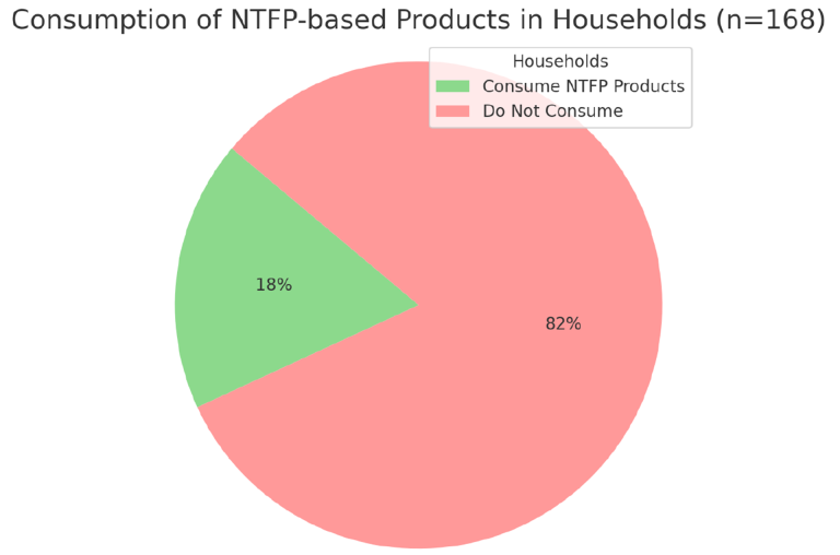 Contrary to what might be expected given the forest proximity, daily consumption of NTFPs or NTFP-derived foods is relatively low among the households. According to the survey, only 18% of households reported regularly consuming NTFPs (in the form of wild fruits, tubers, greens, mushrooms, or products like mahua flour or herbal decoctions). The vast majority, 82%, do not incorporate NTFPs into their regular diet (Figure 5).