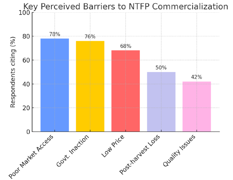 A core part of our investigation was to understand what challenges the community faces in expanding or improving their NTFP-based livelihoods. Through survey questions and discussions, several key barriers were consistently identified. We quantified the frequency of each issue being mentioned by respondents. The results are summarized in Figure 6, which ranks the main barriers by the percentage of respondents who cited them.
