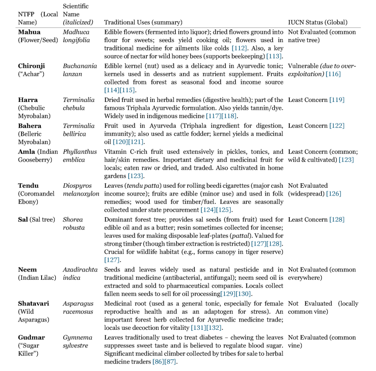 The above table indicates the range of benefits that NTFPs provide: nutrition (amla, mahua), health remedies (harra, bahera, neem, gudmar, etc.), cash income (tendu leaves, chironji, sal seeds), and materials for daily use (leaf plates from sal or dona pattals from Shorea robusta leaves, etc.). The conservation status column also highlights an important point: a species can be globally secure yet locally threatened if harvest is not managed. For example, Buchanania lanzan (Chironji) is listed as Vulnerable in its native range due to heavy exploitation for its nuts [114][133]. Our findings support this, as villagers mentioned that they have to go deeper into the forest to find Achar trees nowadays compared to the past. Conversely, species like mahua and tendu are still quite common in the landscape, which bodes well for sustainability if proper care is taken.