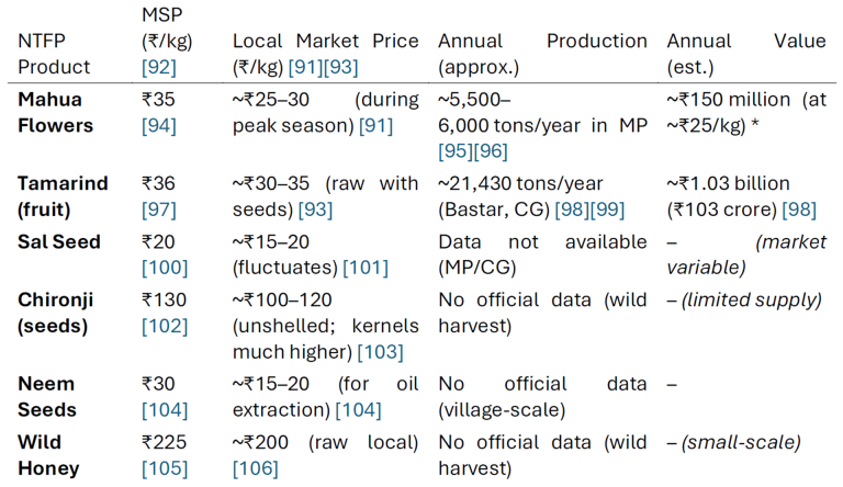 Table 4. Economic Value of Key NTFPs – MSP vs. Market Prices. Data are illustrative for Madhya Pradesh (MP) or neighboring regions, compiled from government reports and literature. “Annual production” is an approximate figure for the state or region, and “Annual value” is a rough estimate of the product’s worth (in INR) at the given price.