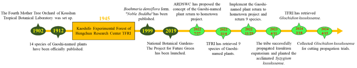 Currently, the Koushun Tropical Botanical Laboratory has been renamed the Hengchun Research Center, Taiwan Forestry Research Institute (TFRI), which is ongoing to continue research on collecting and conserving tropical plants in Taiwan. In addition, the Fourth Mother Tree Orchard has been renamed the Kaoshifo Experimental Forest, equipped with permanent plots to monitor and study long-term changes in the forest ecosystem.